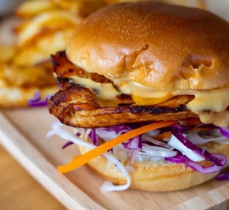 A juicy wagyu beef delight topped with crispy bacon, a sunny-side egg, tangy pineapple, beetroot, american cheese, fresh tomato, crunchy pickle, and smoky BBQ sauce.